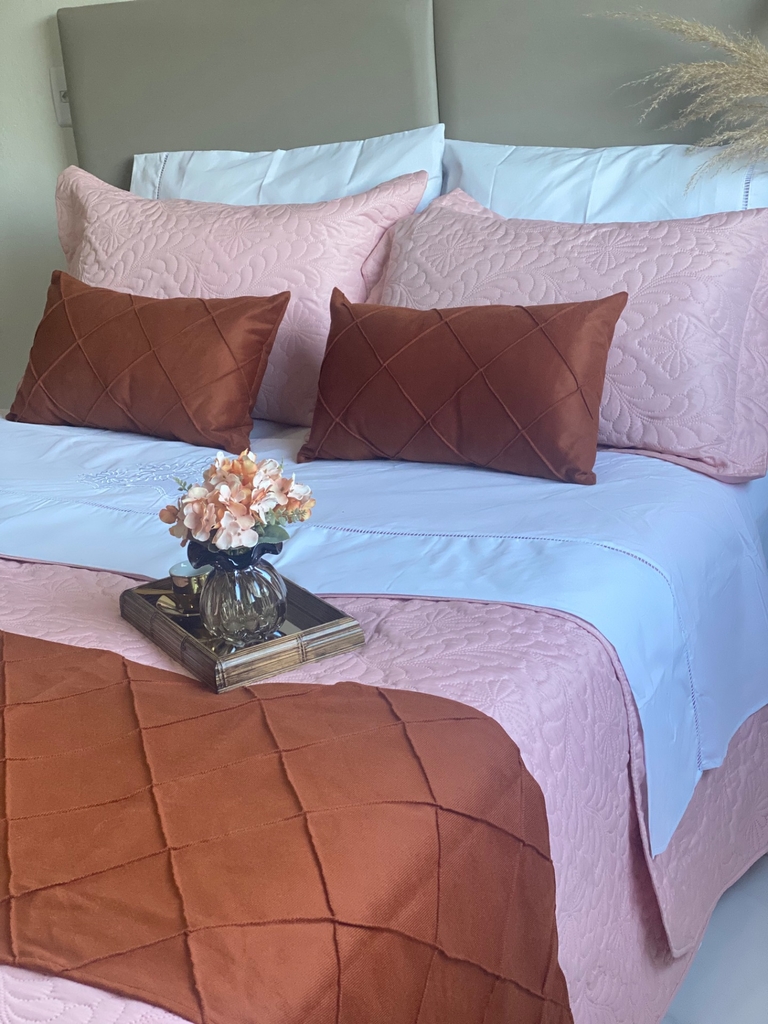 Transforme seu quarto com o Kit Peseira Decorativa com Almofadas Drapeada Terra Cota - Queen/King, uma peça que une sofisticação e conforto para renovar seu ambiente com elegância.